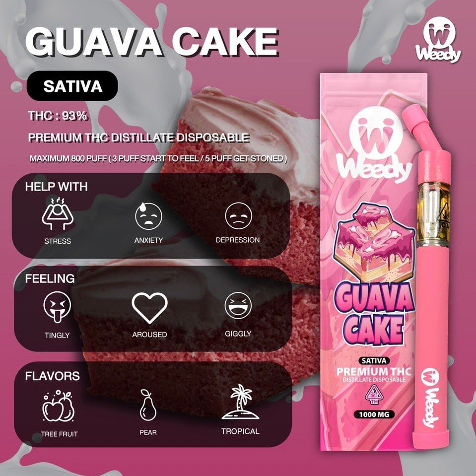 Guava Cake เป็นสายพันธุ์กัญชาลูกผสม ที่เชื่อกันว่าพัฒนามาจากสายพันธุ์ Wedding Cake ซึ่งช่วยให้รู้สึกผ่อนคลาย มากกว่าทําให้กระปรี้กระเปร่า เอฟเฟคของ Guava Cakeจะทําให้คุณรู้สึกซ่า เร้าอารมณ์และหัวเราะคิกคัก ผู้ใช้ Leafly รายงาน ว่าสายพันธุ์นี้อาจทําให้คุณปากแห้งได้ดังนั่นดูด Guava Cakeแล้วควรดื่มน้ำสักแก้ว ผู้บริโภคชอบใช้สายพันธุ์นี้เมื่อพบอาการที่เกี่ยวข้องกับภาวะซึมเศร้า ความเครียด และความเหนื่อยล้า Guava Cake มีกลิ่นหอมหวานของลูกแพร์และผลไม้จากต้นไม