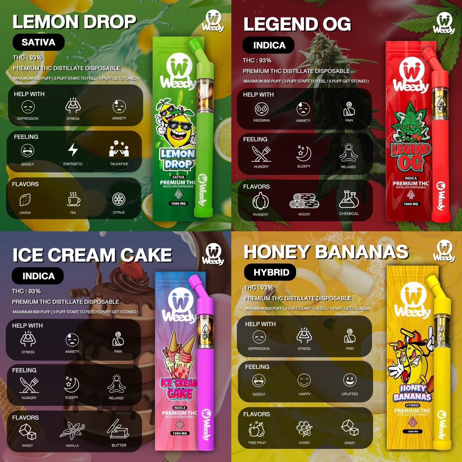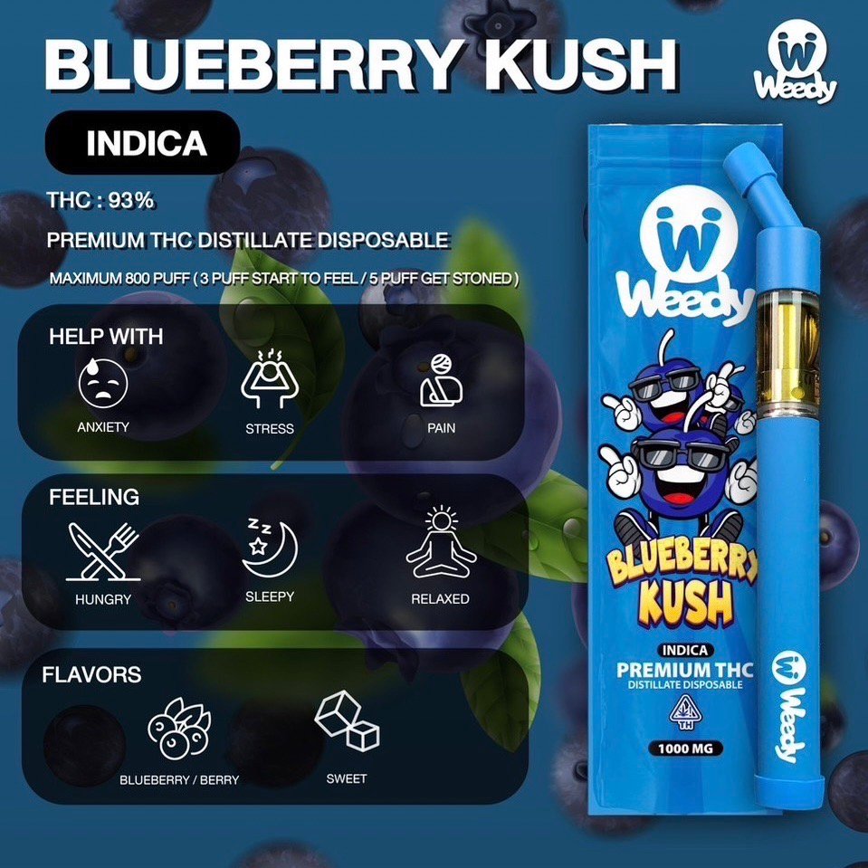 พอตกัญชา WEEDY เป็นพอตแบบใช้แล้วทิ้ง ที่ผลิตจากน้ำมันกัญชาเกรด Cat 3 + Live Resin และ THE (High Terpene Extract) โดยมีค่าที่สูงถึง THC 93% และได้มีการผลิตจากแลปที่มีชื่อเสียง แถมเป็นที่รู้จักกันอย่างกว้างขวางจากประเทศอเมริกาอีกด้วย