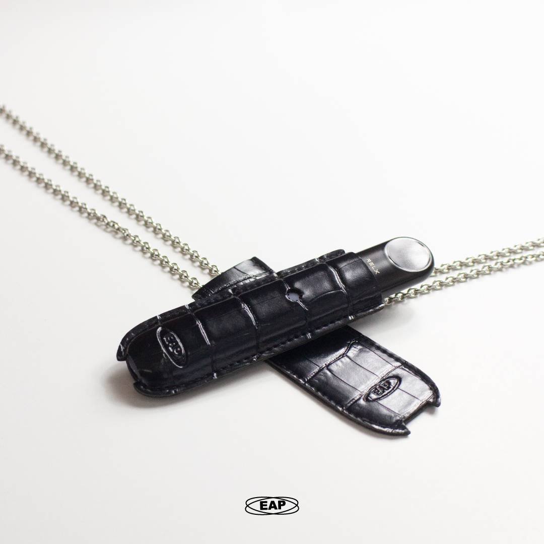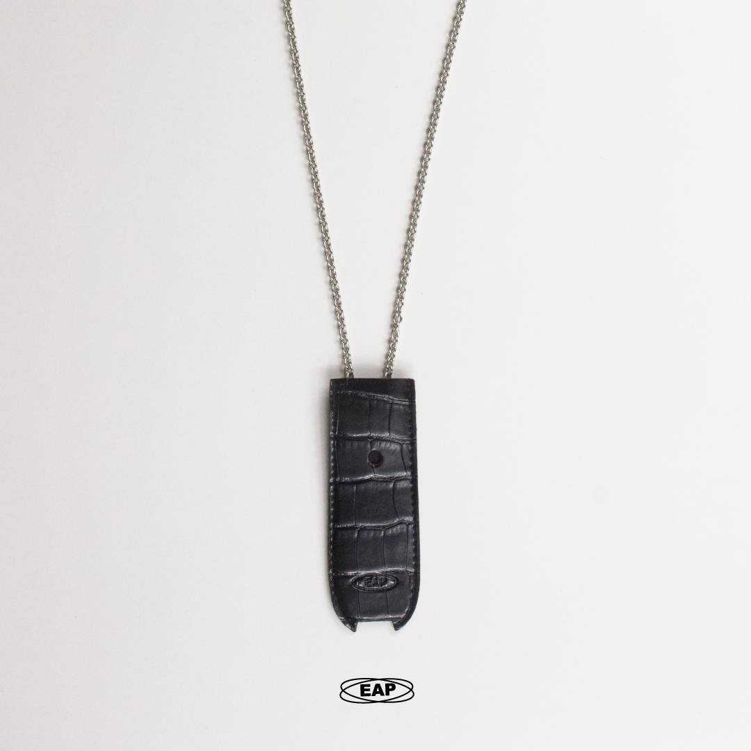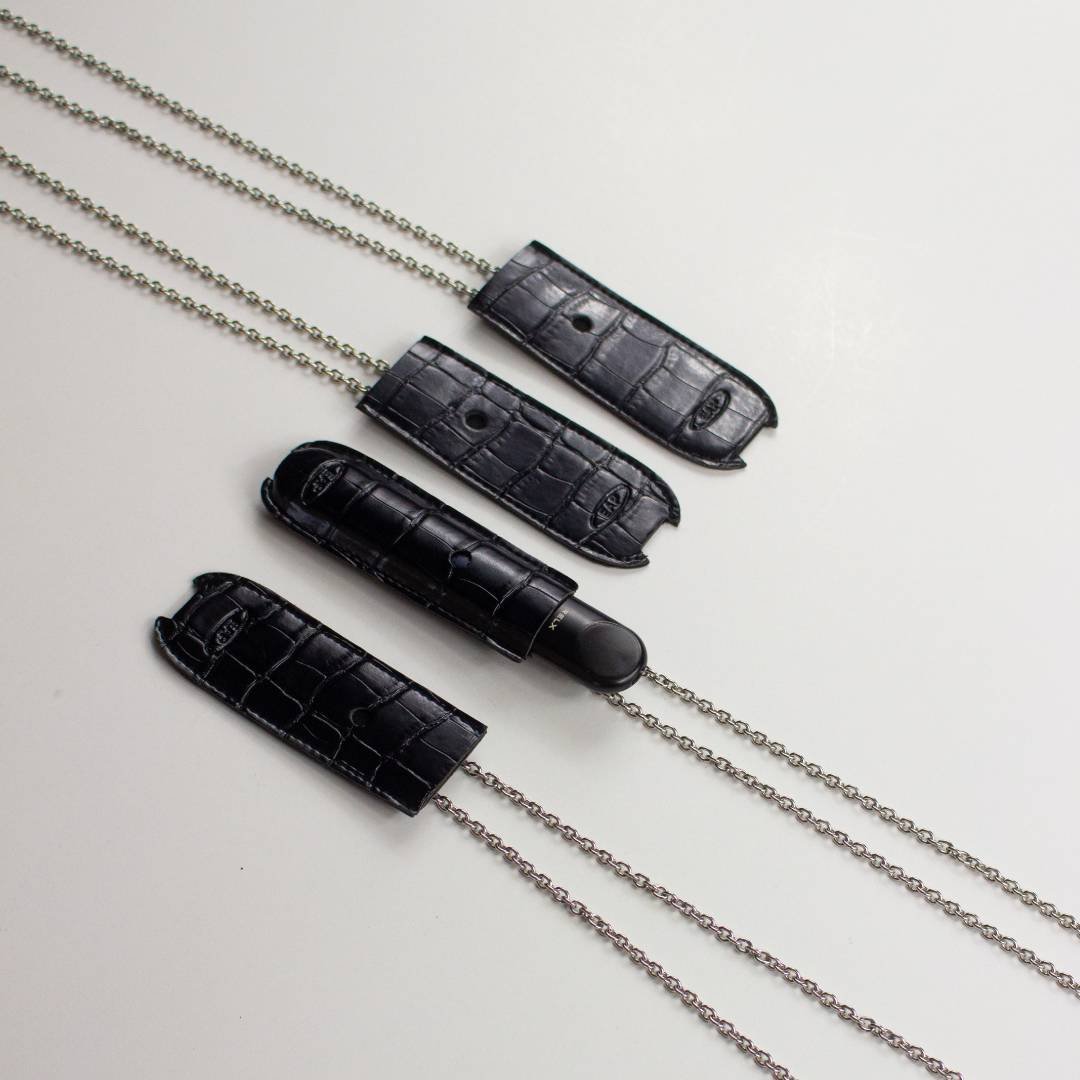 Faux Crocodile skin texture in soft PU leather, Stainless steel chain, Embossed logo on leather Port at bottom and ready to charge