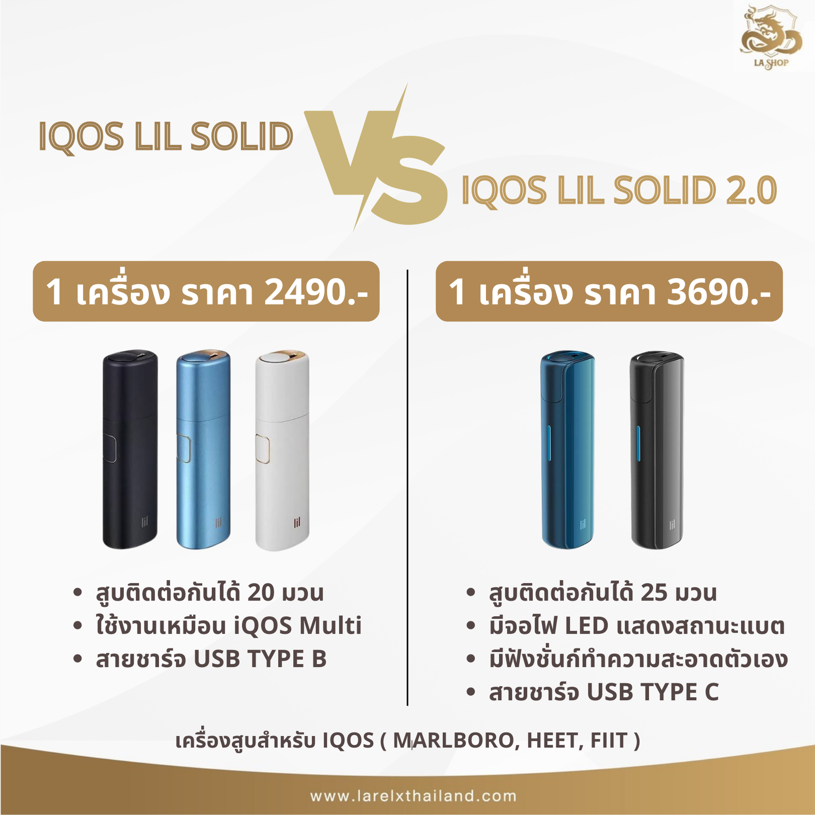 IQOS Lil Solid 2.0 ราคา 3,690 ฿ พร้อมส่งทั้ง 2 สี จัดส่งสินค้าทั่วประเทศไทย สามารถใช้กับบุหรี่ไส้ไอคอส มาโบโร่ Heets ได้