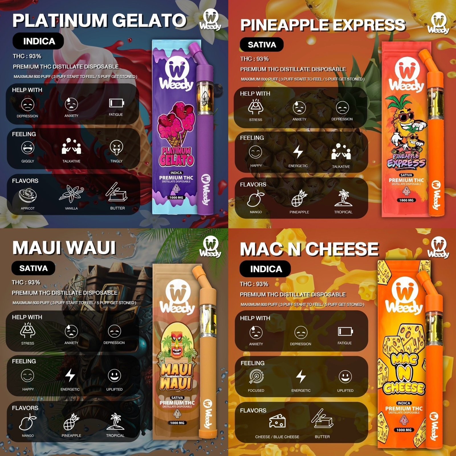 พอตกัญชา WEEDY เป็นพอตแบบใช้แล้วทิ้ง ที่ผลิตจากน้ำมันกัญชาเกรด Cat 3 + Live Resin และ THE (High Terpene Extract) โดยมีค่าที่สูงถึง THC 93% และได้มีการผลิตจากแลปที่มีชื่อเสียง แถมเป็นที่รู้จักกันอย่างกว้างขวางจากประเทศอเมริกาอีกด้วย